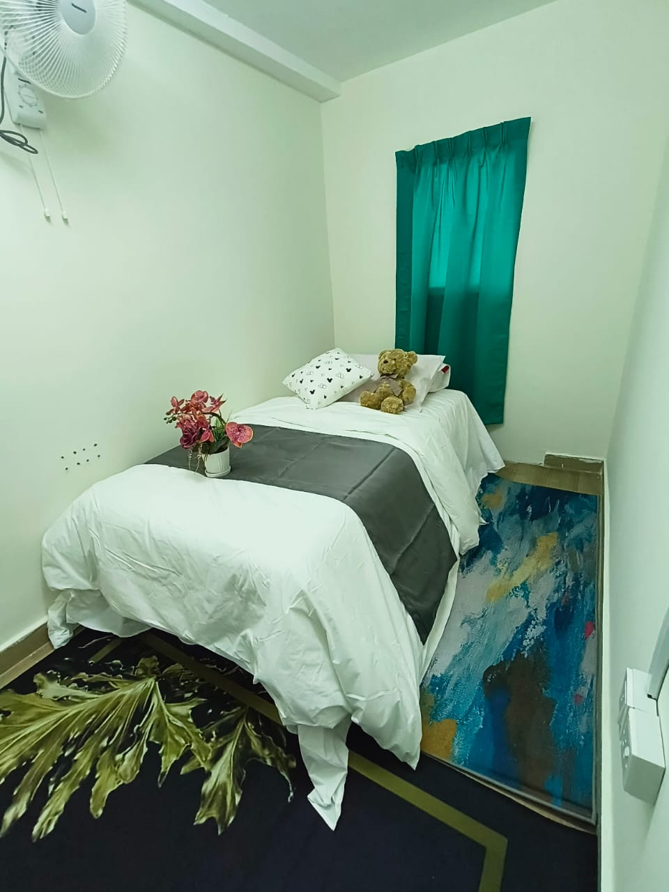 Bilik-bilik kami dilengkapi dengan pelbagai kemudahan seperti mesin basuh, kipas angin, peti ais, katil, tilam, penapis air, seterika dan free wifi. Kami juga menyediakan cadar, selimut dan bantal dengan percuma.
